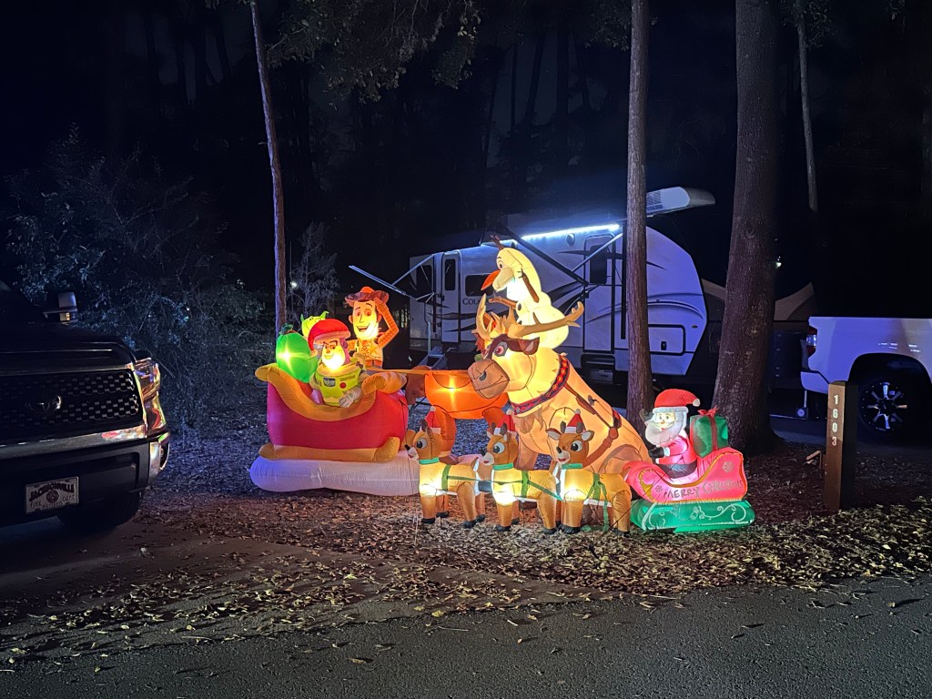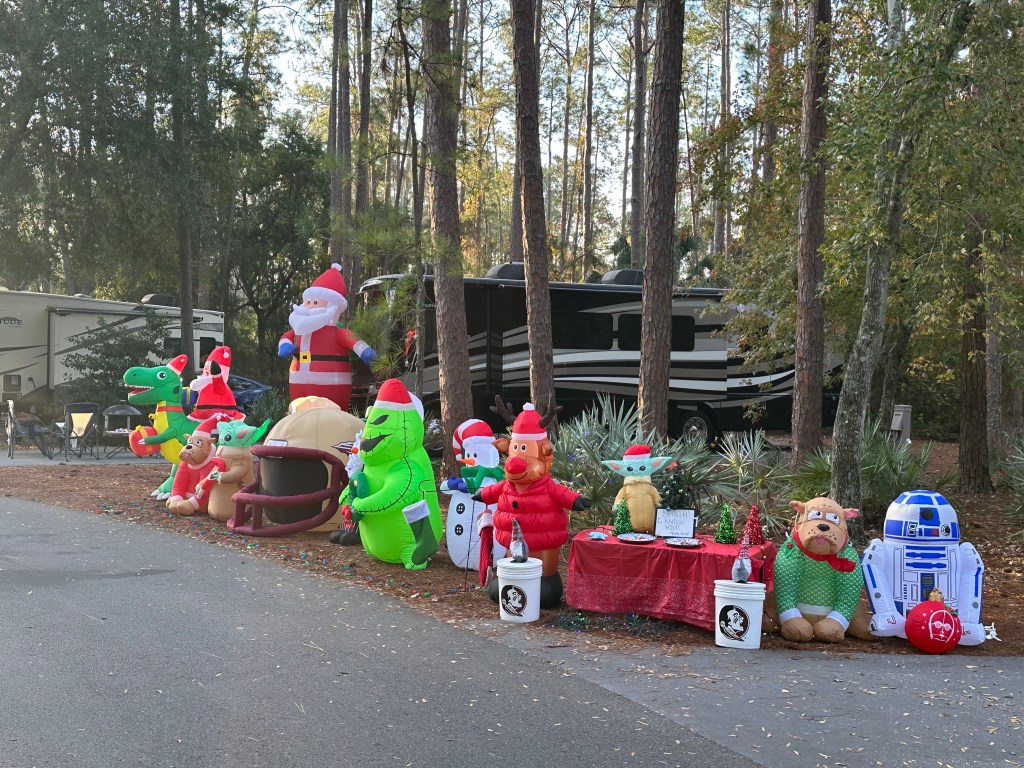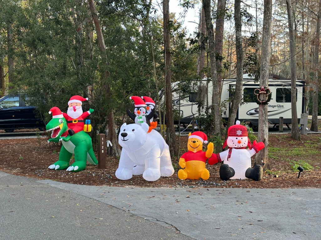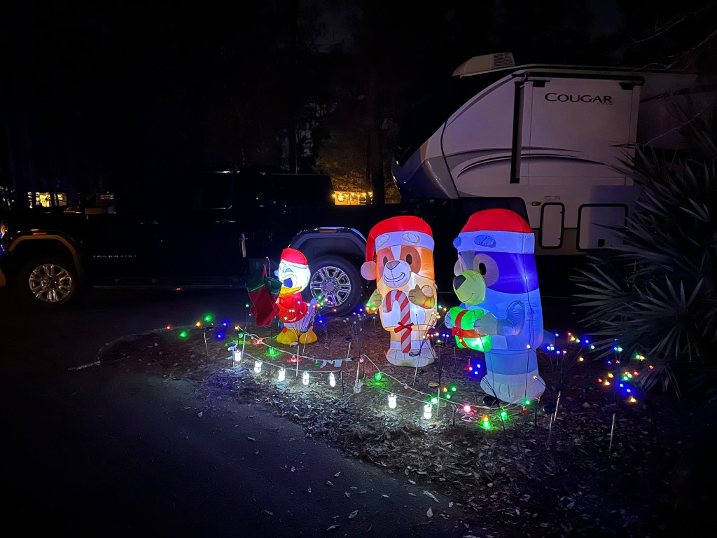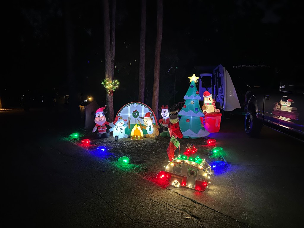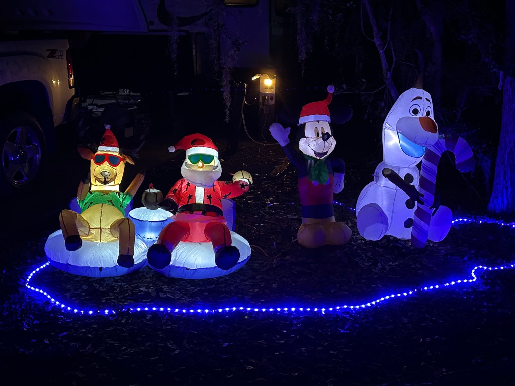 But this one was special, and it deserves its own post… because the people made it magical. The campground was huge and quite full, and most of the guests had decorated their lots, trailers, and golf carts with Christmas decorations. Then, each evening, when the lights came on — that’s when the magic truly happened.