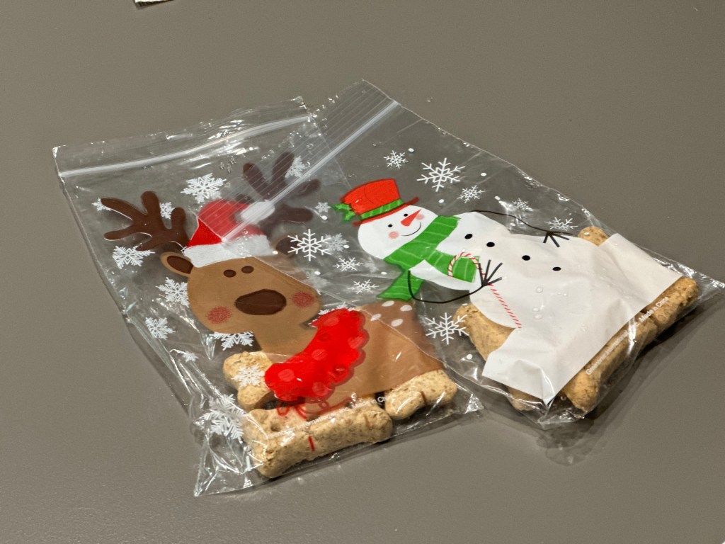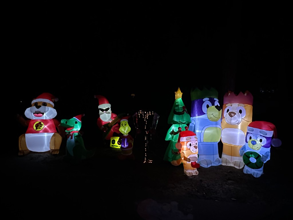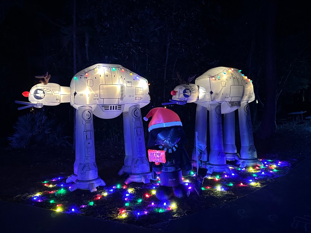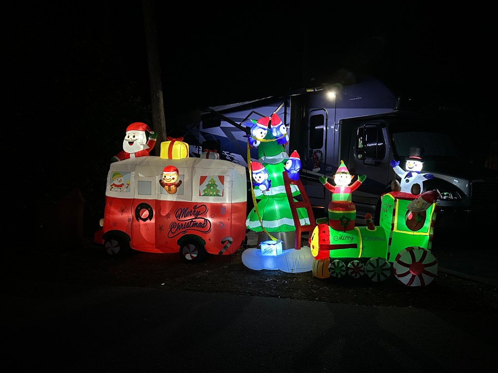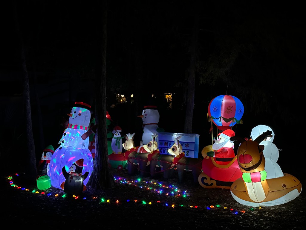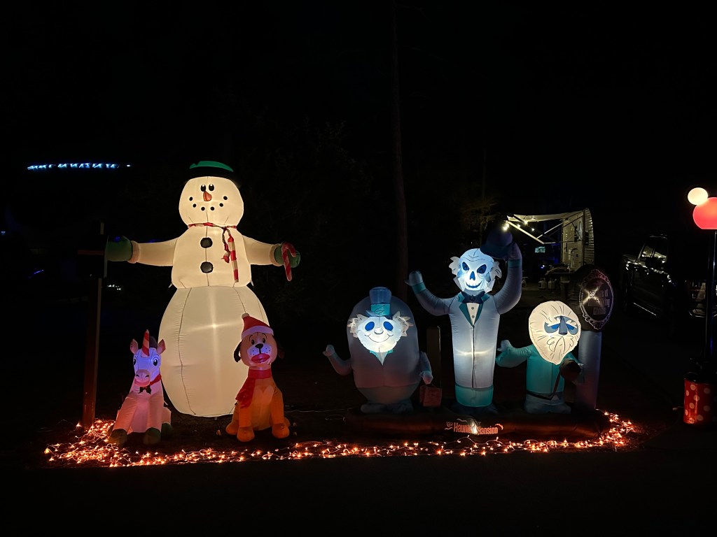 Most of the decorations were inflatable, but some people also had string lights, and a few had tables set up with free cookies. Everyone was smiling, cheerful, and merry!